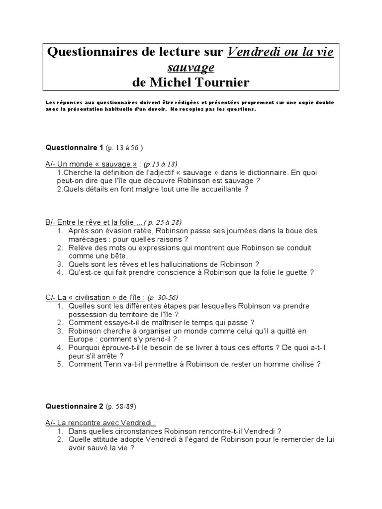 Questionnaires De Lecture Sur Vendredi Ou La Vie Sauvage Pdf